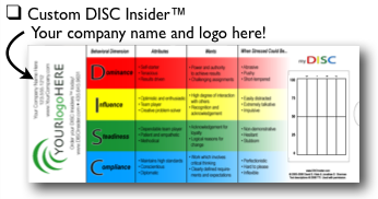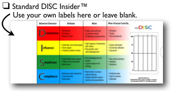 Increase learning retention! Increase ROI! As you may know, learning retention usually drops significantly within days of exposure to a new concept or training. When a company has invested financial and time resources in DISC assessments, training and coaching, it is important that the learning translates to both behavioral awareness and change. The DISC Insider helps people remember the key elements of the four behavioral styles, and aids in the rapid application of important communication and relationship skills. It is an excellent on-going reference when interacting with others.